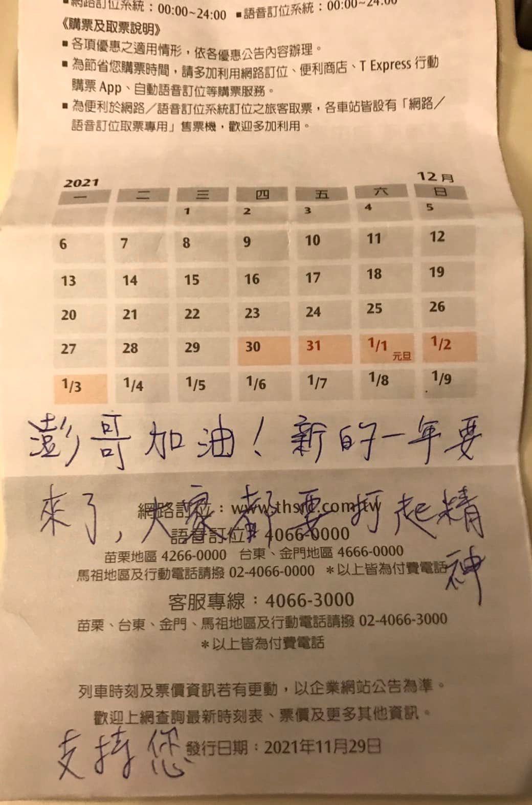 澎恰恰本以為有什麼事,但員警只是把一張寫了字的時刻表放在他的座位旁邊,並對他點頭示意。員警戴著口罩,不過仍能感受到親切感。澎恰恰打開紙條,看到上面寫著:「澎哥加油!新的一年要來了,大家都要打起精神,支持您。」