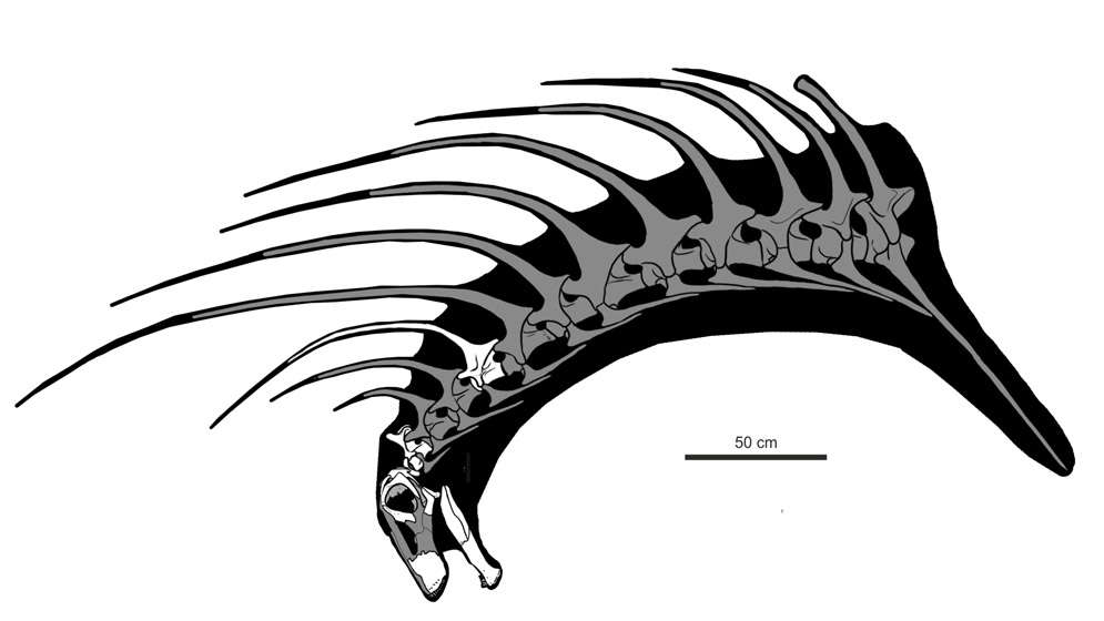 ▼這種恐龍的脖子、尾巴都很長,腦袋小小的。牠們很可能是一種草食性動物,生活在白堊紀初期,侏羅紀時期之後。阿瑪加龍跟這種恐龍屬於同一科,不過阿瑪加龍生活在1.3億年前。阿瑪加龍的背部也有凸起的尖刺,不過相對來說要短很多,而且那些凸起主要是以儲存脂肪為主,類似於駱駝的駝峰。