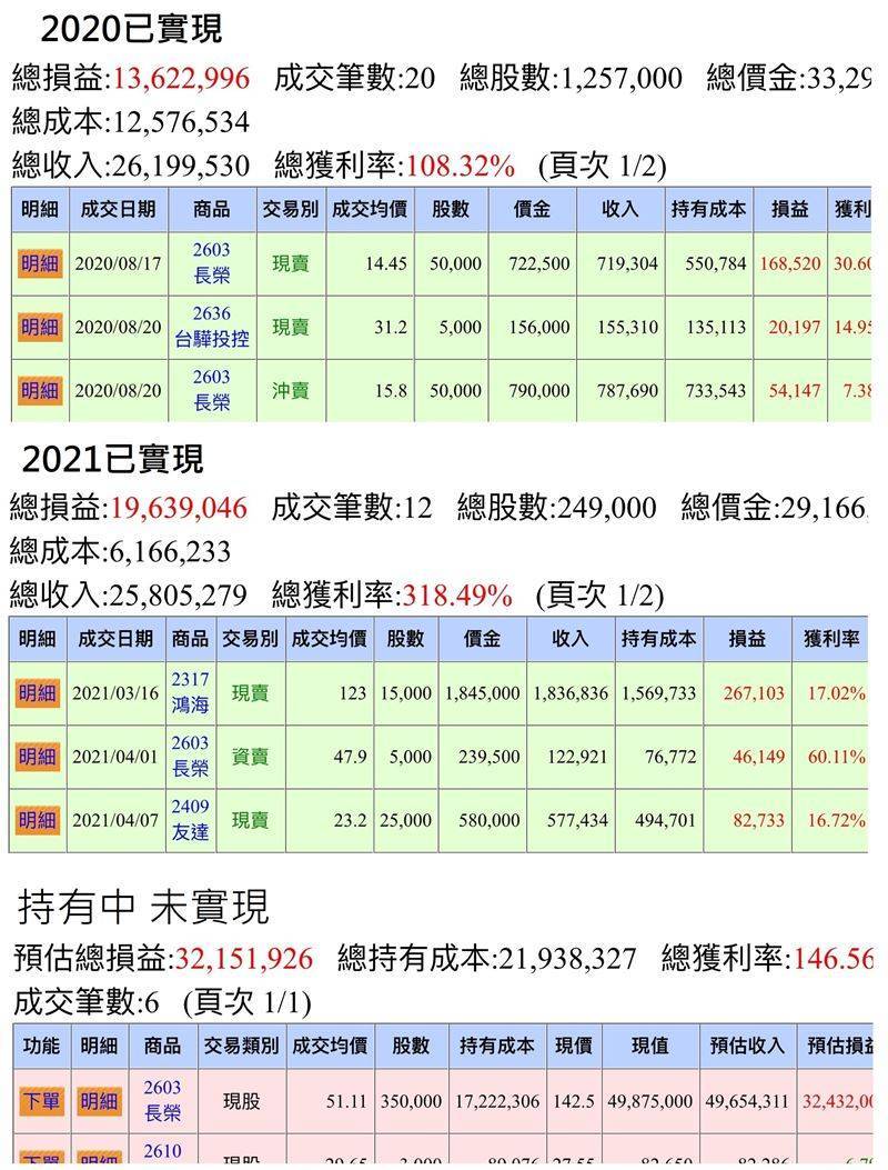 面對前同事們的冷嘲熱諷,原po非常淡定。他沒有打算復職,因為他已經靠買賣股票實現了財富自由。2020年實現獲利逾1300萬、2021年實現獲利超過1900萬。如果加上未實現的獲利逾3200萬,他已經賺到6400多萬,而且99%的獲利來自長榮。原po透露,融資加上現股最高曾持有900張長榮股票,目前他還有部份尚未出脫。