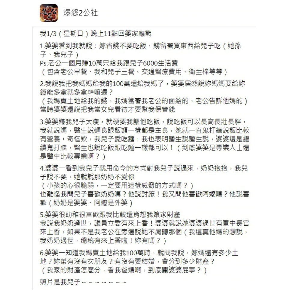 原po表示,老公一個月賺10萬,卻只給她和兒子6000元生活費,這些錢包含3人的早餐、交通醫療費用、衛生棉等等。婆婆竟然還說:「妳省錢不要吃飯,錢留著買東西給兒子吃(她孫子、我兒子)。」原po將媽媽賣土地給她的100萬歸還,婆婆知道後說:「妳媽媽要給妳,錢能多拿就多拿,幹嘛還?」她狂問原po的媽媽有多少塊土地、原po的弟弟之後會不會結婚,甚至想幫原po保管娘家人給的錢。