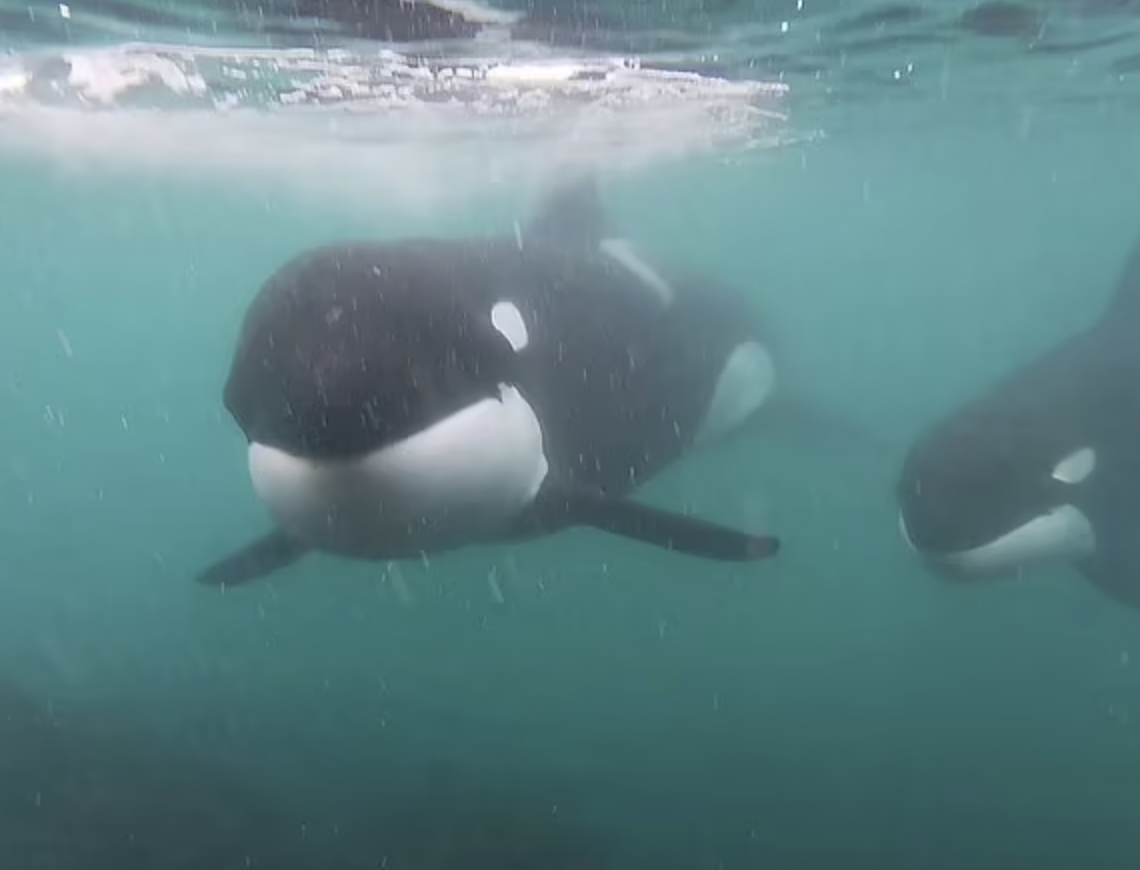▼Steve表示,他一開始看到2隻虎鯨脫離群體朝自己游過來,非常擔心自己的安全。後來他才意識到,那2隻虎鯨只是想來打個招呼而已。這群虎鯨非常聰明,也很友善,牠們好奇地在Steve旁邊游來游去,還歪頭觀察人類,那模樣非常呆萌。