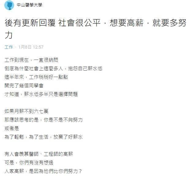 2022年01月12日很多人抱怨現在物價漲、薪水低,社會很不公平。最近一位自稱外科醫師的網友在「Dcard」發文,表示自己有不同的看法。他認為現今的社會已經夠公平,人人都有拚的機會,如果一個人的薪水沒有6、7萬,不應該怪社會,應該怪自己:「你是不是不夠努力,或者是為了輕鬆,放棄了好薪水?」