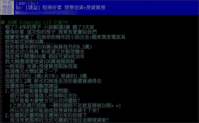 ▼原po表示,他和老婆、小孩已經租房7、8年,厭倦了頻繁搬家的生活,非常渴望有一間自己的房子。現在租房的房東有意賣房,開價約650萬,讓他買房的想法更加明確。他和老婆收入狀況穩定,每月家庭總收入約8.3萬,存款有30萬左右,因此想用「信貸湊頭期款+房貸」的方式買房。