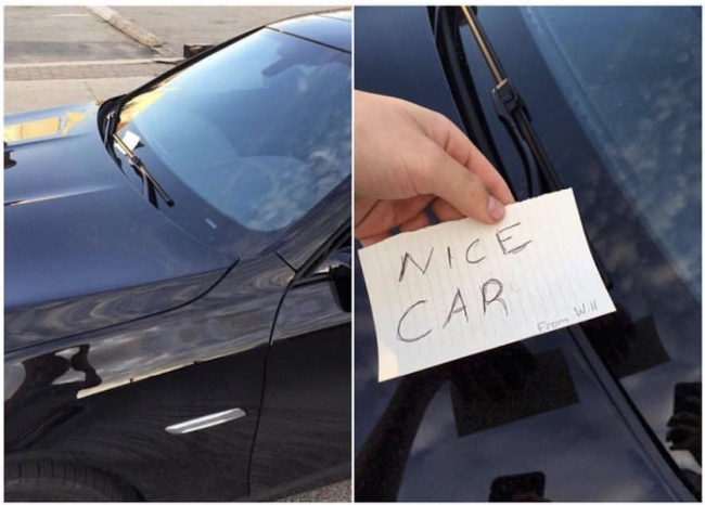 ▼民眾:「我以為我收到了罰單,但更重要的是,我忘了我身在加拿大。」照片中的車主,收到了一張夾在雨刷上的小字條,上面寫著:「你的車帥慘了。」不管是對人、事、物、景,加拿大人果然從不吝嗇他們的大方讚美啊!