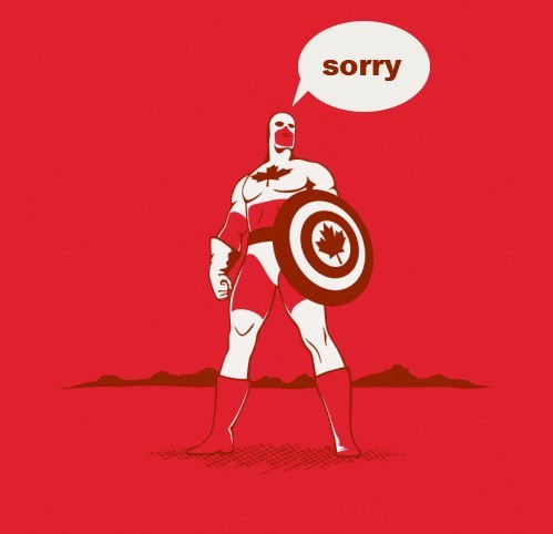 ▼如果真有所謂的「加拿大隊長」,形象圖大概就會是這個樣子,嘴巴裡喊的口號永遠都是「不好意思」。用來比喻文雅有禮的加拿大人,再適合不過了!就算被外國人嘲笑說,他們的客氣與溫和,實在是太過老套守舊,但加拿大人也不會生氣,甚至還會跟著一起幽默的大笑帶過,或頻頻地說著「不好意思」呢!