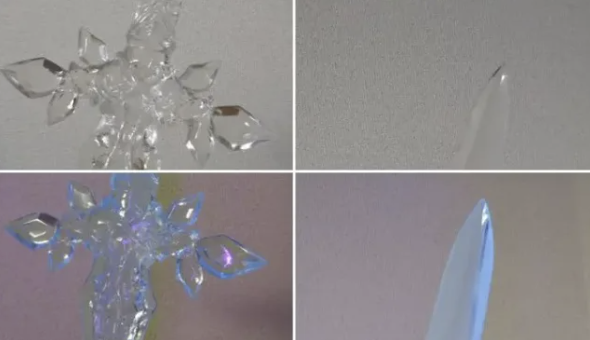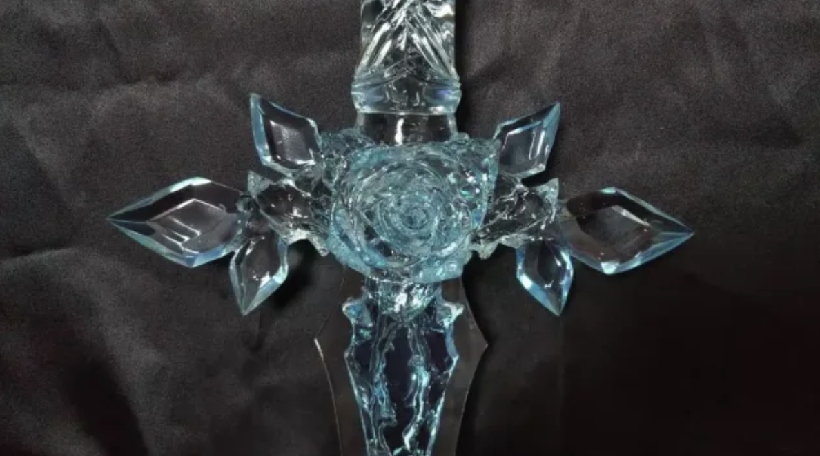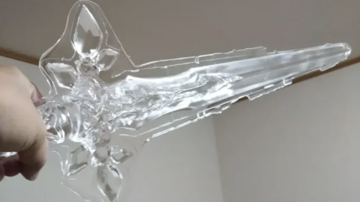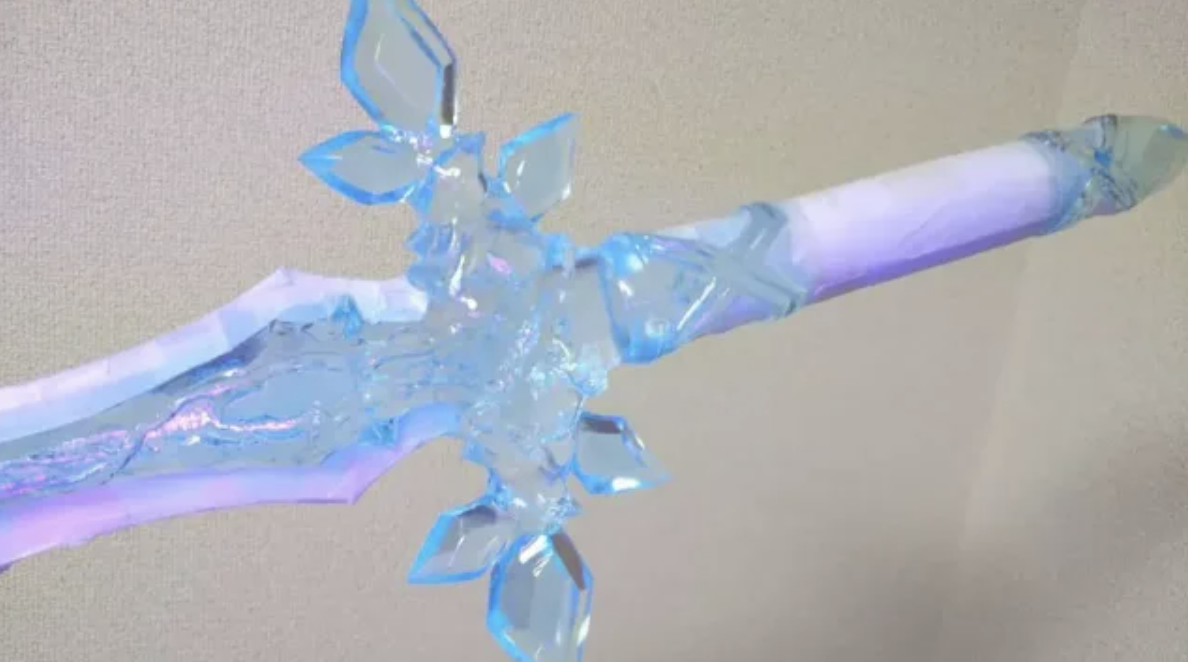 ▼動畫中的「藍薔薇之劍」讓人印象深刻。推主用透明樹脂製做劍身,讓它呈現出一種晶瑩剔透、微微泛藍的感覺,外觀非常精緻,就像水晶質感,讓人看得嘖嘖稱奇。
