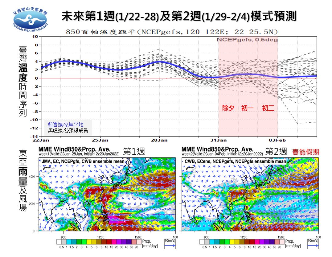 災害預報士賈新興則表示,未來幾天會有一波東北風到來,29、30日小年夜,目前看來會有一波冷空氣比較強,歐洲預報冷空氣有增強趨勢,台北恐下探14度,而且30日這天不只北邊冷空氣,南邊還有水氣北移,雨水多。冷空氣強度還要繼續觀察,但基本上雨水比較多。