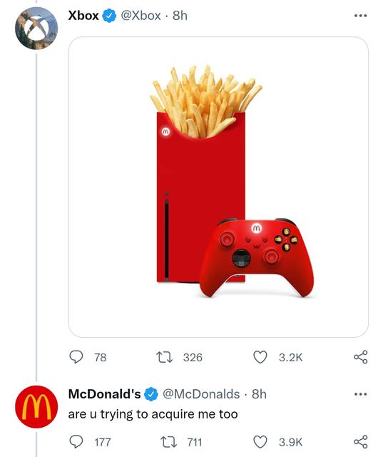 2022年01月24日最近微軟以近700億美元現金收購動視暴雪的消息震驚業界,沒想到微軟與麥當勞也有趣味互動。微軟在推特上po出一張紅黃配色的Xbox Series X的麥當勞薯條特仕機圖片,麥當勞則幽默回應:「你除了動視暴雪以外也想收購我?」