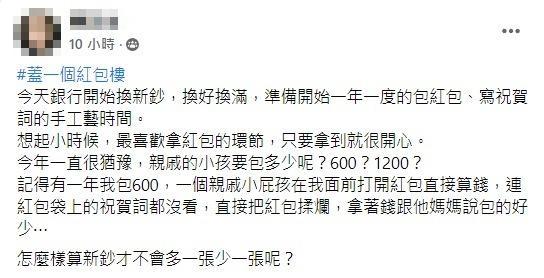 原po表示,她24日一早就到銀行換新鈔,「準備開始一年一度的包紅包、寫祝賀詞的手工藝時間」。但她非常猶豫,「親戚的小孩要包多少才好?600元、1200元?」