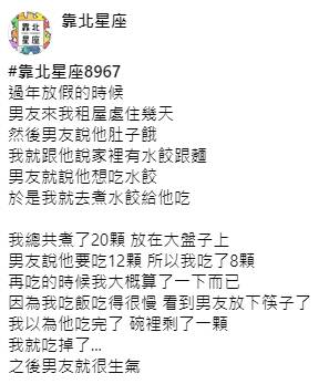 原po表示,他跟男友交往三個月,這是兩人第一次吃水餃。當時原Po煮了20顆,男友說要吃12顆,所以她吃了8顆。原Po吃得比較慢,她看到男友放下筷子,以為對方吃完了,就將碗裡剩下的一顆吃掉,沒想到男友不爽了,問她「有沒有算吃了多少顆」,聽到原Po說沒有算,還說:「你連這種事都記不起來,以後我們嫁進來我們家怎麼辦?」