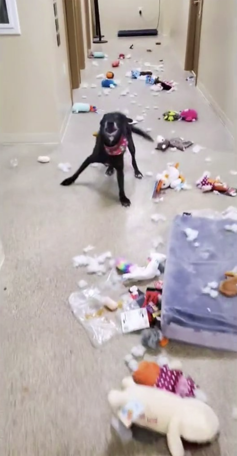 ▼Gilligan開心地又跑又跳,大家看得哭笑不得。Joyce說:「牠大概是等所有人都離開後才開始行動的。牠把我們之前聖誕節時收到的捐贈玩具翻了出來,而且只挑會發出『吱吱』聲的。牠一點也不愧疚,還很開心地看著我們。」Gilligan非常喜歡會發出「吱吱」聲的玩具,這次自己偷偷開趴,也是專門去翻這種玩具,沒有亂動零食和其他東西。