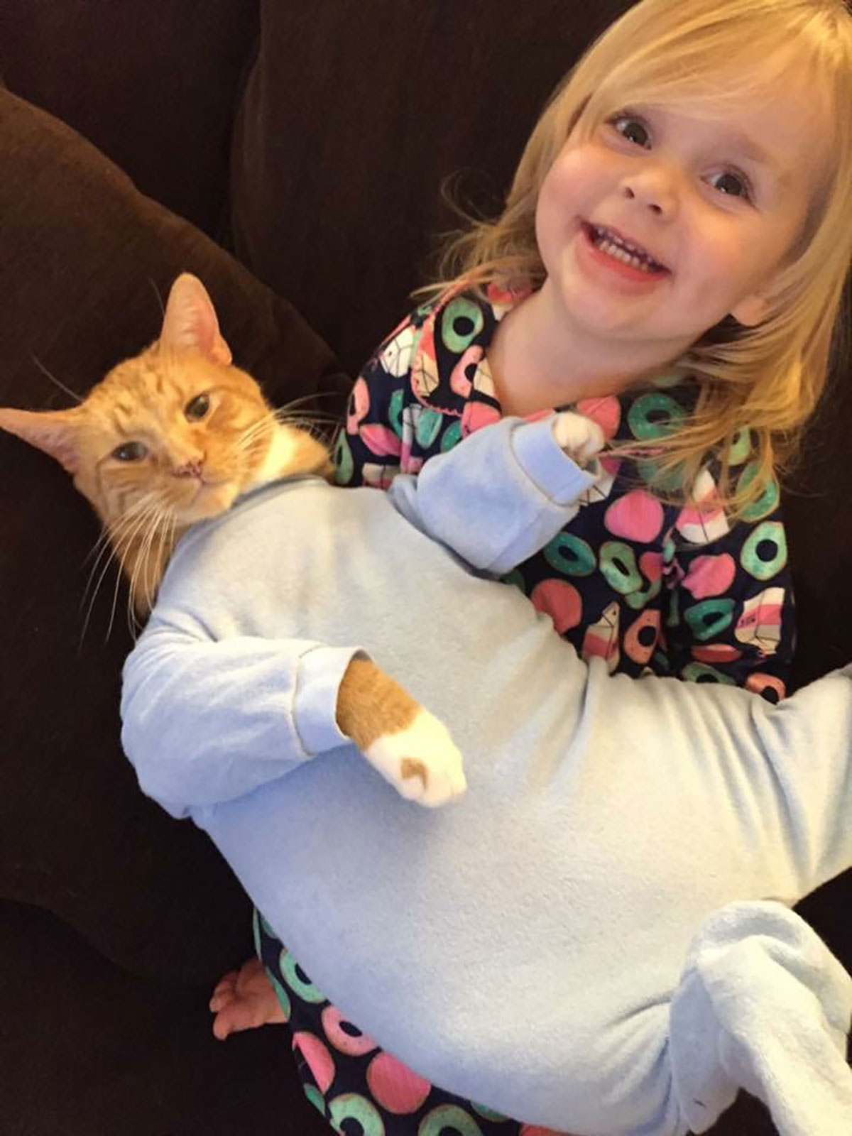 ▼Erin將貓咪與孩子們親密互動的畫面拍攝下來,她認為這是很珍貴的回憶。Bailey每天都陪在Abby身邊,他們一起玩耍、一起睡覺,Abby還會唱《你是我的陽光》(You Are My Sunshine)哄Bailey入睡。