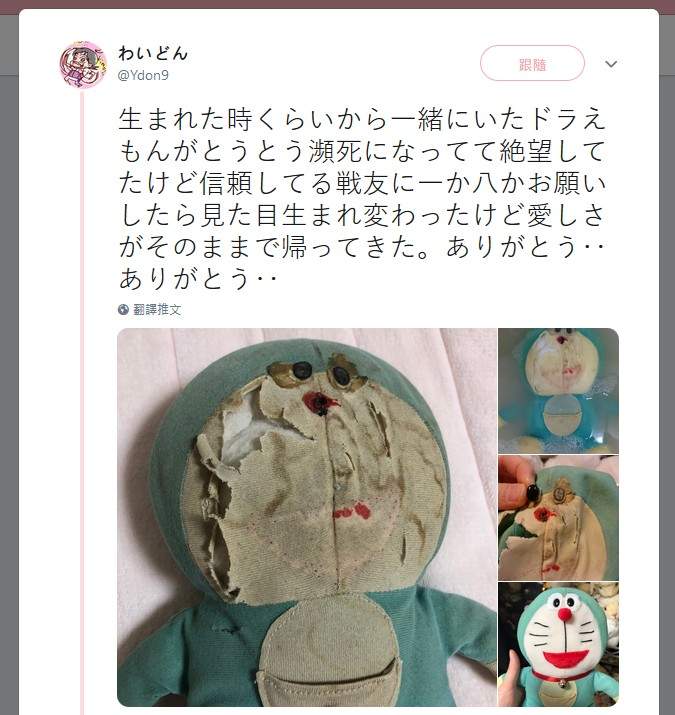 這個哆啦A夢娃娃是わいどん心靈的寄託,暖心的朋友把娃娃修復得完好如初,真是太棒啦~