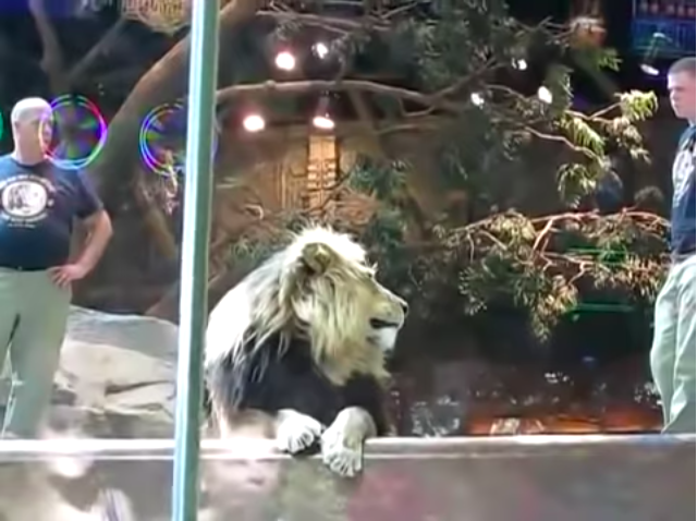 ▼欄舍中有2隻獅子,一隻雄獅、一隻雌獅。兩名飼育員走進欄舍,好像準備做什麼表演。雄獅趴在地上,左右打量欄舍外的遊客,偶爾還打個呵欠,一副百無聊賴的模樣。母獅則在另一邊咬什麼東西,玩得很開心。