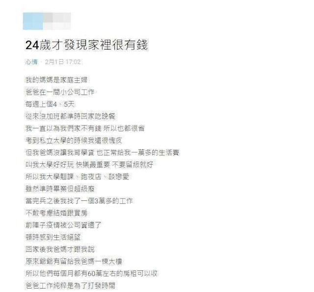 原po表示,他從小認知家中屬於小康家庭,媽媽是家庭主婦,爸爸在一間小型公司工作,每天都會準時回家吃飯,從來沒有加班過。「我一直以為我們家不有錢所以也都很省,考到私立大學的時候我還很愧疚,但我爸媽沒讓我背學貸,也正常給我一萬多的生活費,叫我大學好好玩,快樂最重要」。