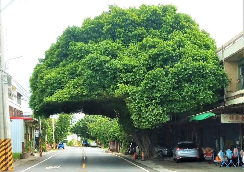 ▼當地民眾解釋說,這棵樹的造型並不是人為刻意修剪的,而是車身較高的貨櫃車、大卡車經年累月行經此處「削」出來的。多年下來,它的造型越來越像安全帽。