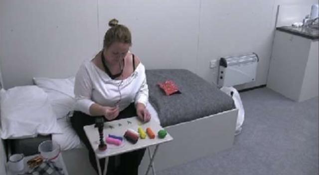 ▼剛開始一切正常,沒想到玩著黏土的Charmayne突然捂著臉哭了起來,她很快穩定情緒接著玩,但實驗開始3.5小時後,她再次避開攝影機,並很快按下紅色按鈕,離開了這間小屋。她離開時剛剛在小屋中待了4小時45分鐘。