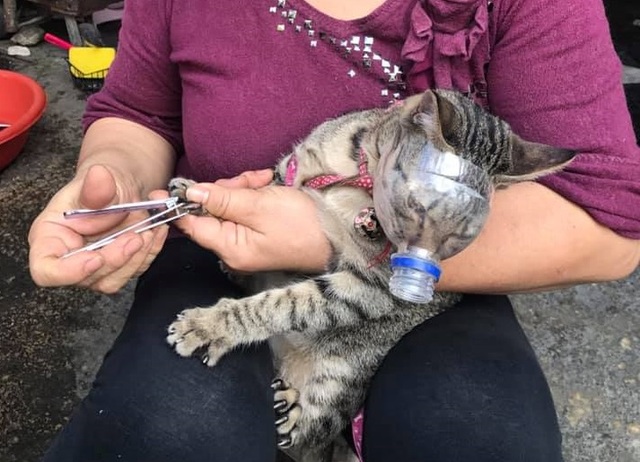 ▼有網友在臉書社團分享了一張照片,原來是他媽媽幫貓咪剪指甲時,竟然聰明的在貓咪嘴上套了一個剪半的寶特瓶!