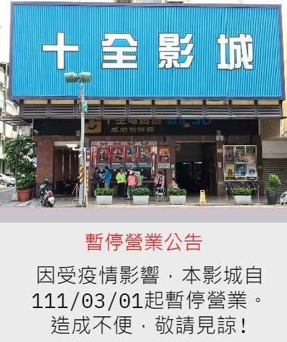 十全影城20日在官網張貼公告說:「因受疫情影響,本影城自111年3月1日起暫停營業。造成不便,敬請見諒!」去年時十全影城也曾公告表示,因為受到新冠疫情影響,6月1日起暫停營業3個月,最後於8月1日提前1個月恢復營業。