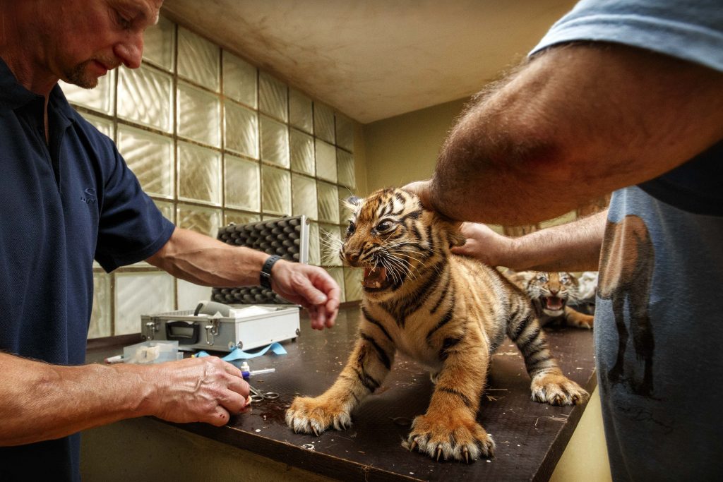 ▼捷克的「伊赫拉瓦動物園」裡,有2隻蘇門答臘幼虎,蘇門答臘虎是老虎中比較小隻的品種,但目前是屬於極度瀕臨滅絕的物種,而這2隻只有2個月大的小老虎正在接收獸醫的例行檢查。