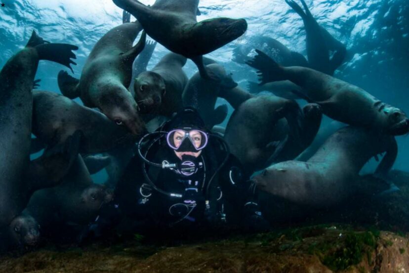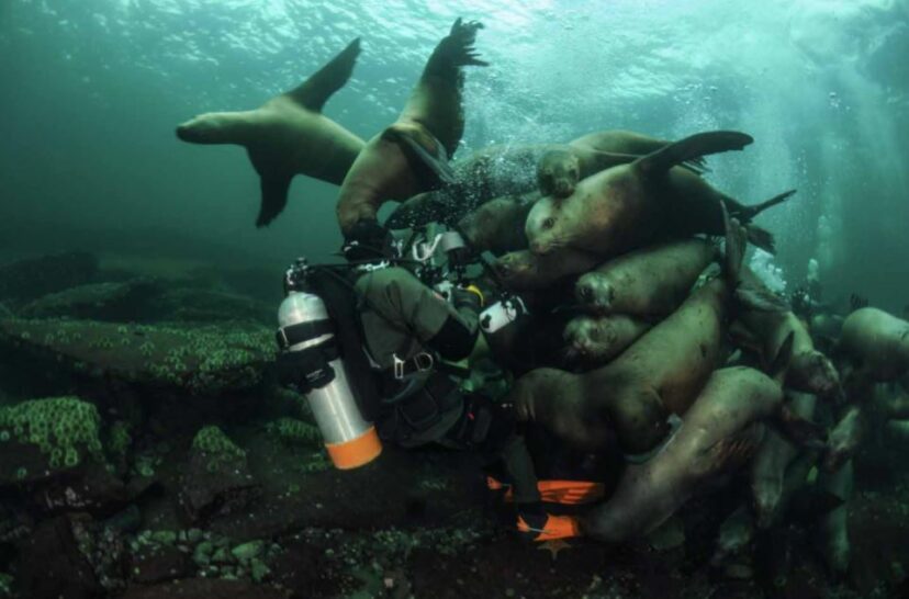 ▼海獅們正在這一海域等待鯡魚群的到來,被海獅團團圍住的Steve說:「最讓人驚嘆的是動物的數量遠遠超過了人類。這片海域是獨一無二的,世界上不可能再有一個地方,會有這麼多野生動物主動跟人類友好互動。」