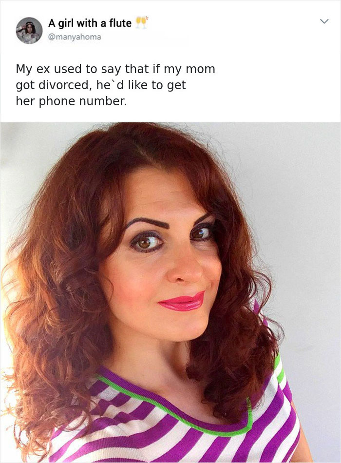 ▼「我前男友說如果我媽離婚了,他會想跟她要電話。」