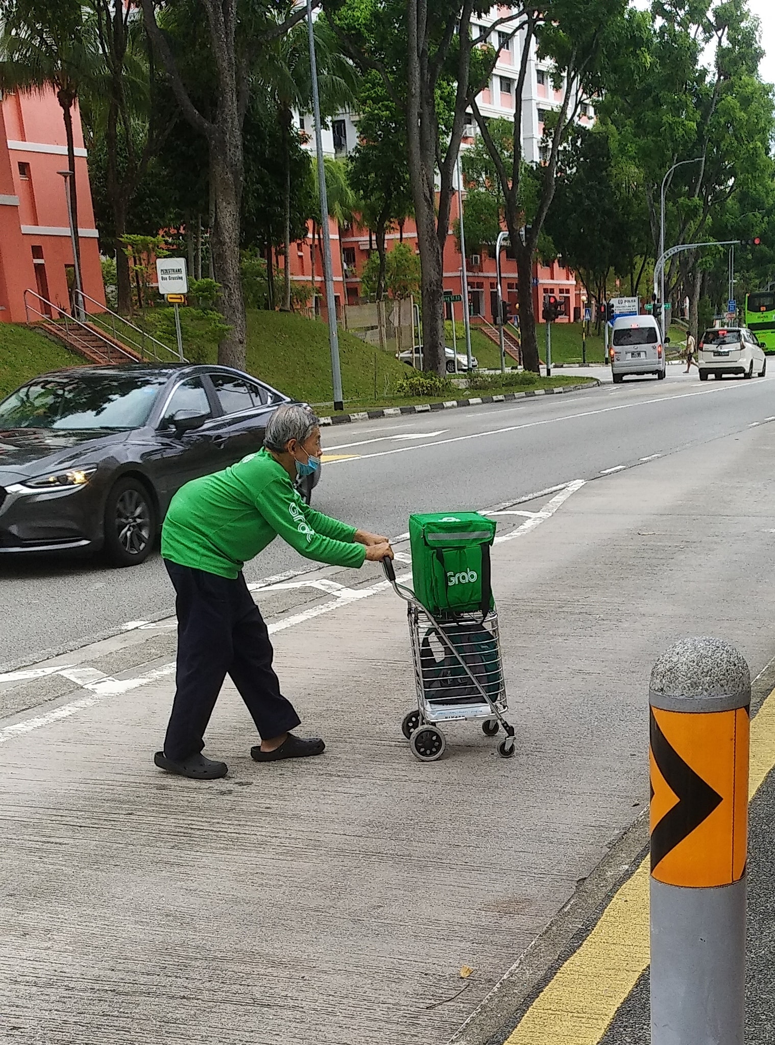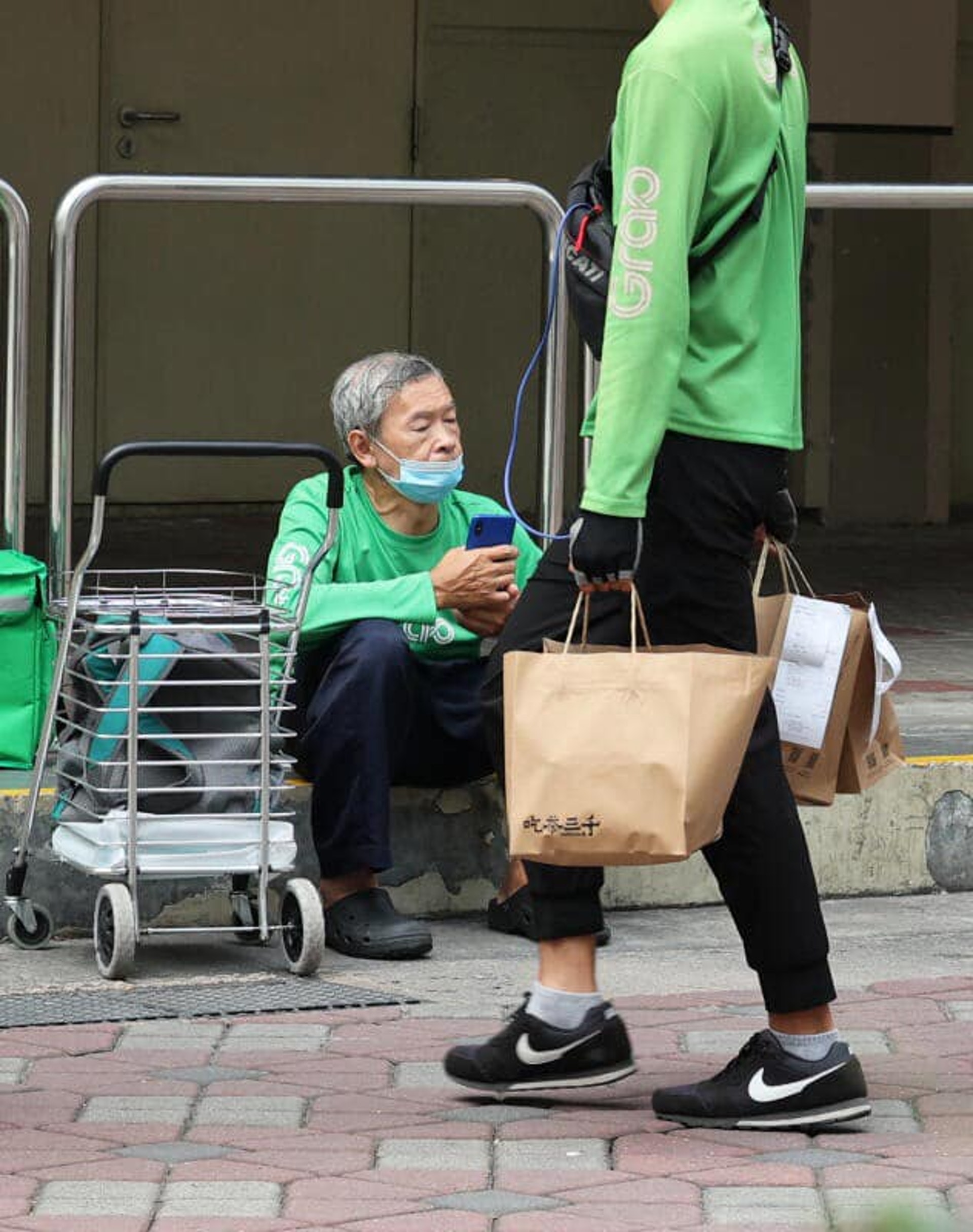 黃老伯伯花費200新加坡元(約台幣4146元)買了一台智慧型手機,然後在Grab上註冊,成為了一名外送員,並花了好長時間熟悉平台的操作介面。黃老伯伯沒有交通工具,平時他會將外送保溫箱放在自己的推車上,然後搭乘大眾交通工具或走路外送。