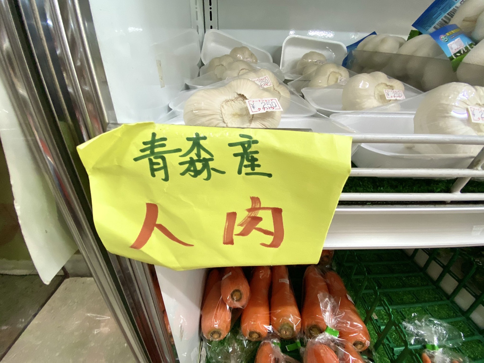 ▼「青森產人肉」,這個名字超恐怖,其實仔細看看照片就知道,這裡說的「人肉」其實是「大蒜」。大蒜的日文讀音「ニンニク」可以寫作漢字的「人肉」,這才出現了照片中的畫面。
