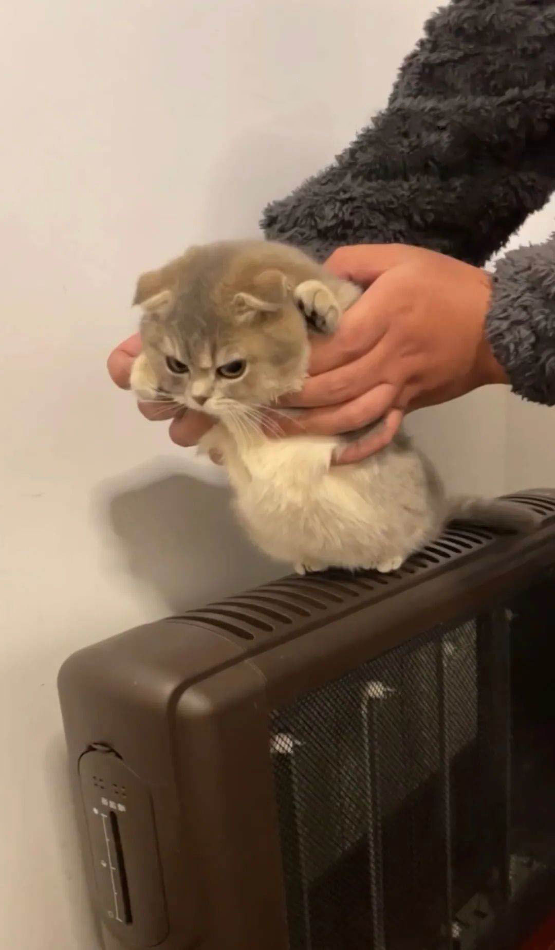▼飼主抱起貓咪,貓咪卻不願意離開。牠的腳腳堅持踩在電暖器上,圓嘟嘟的小臉上掛著委屈的表情,好像在說:「我不要離開,這是家裡最舒服的地方,我才不要走!」