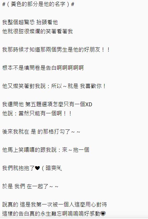 ▼當時原po驚恐得頭腦一片空白,男生給了她一個燦笑說道「所以,就是我喜歡你。」這時原PO也才意識到這是告白,而那2名說要填問卷的男大生其實是男生的好麻吉,特地出面義氣相挺。想當然的,原po也在「是,我願意」那一格打了勾!