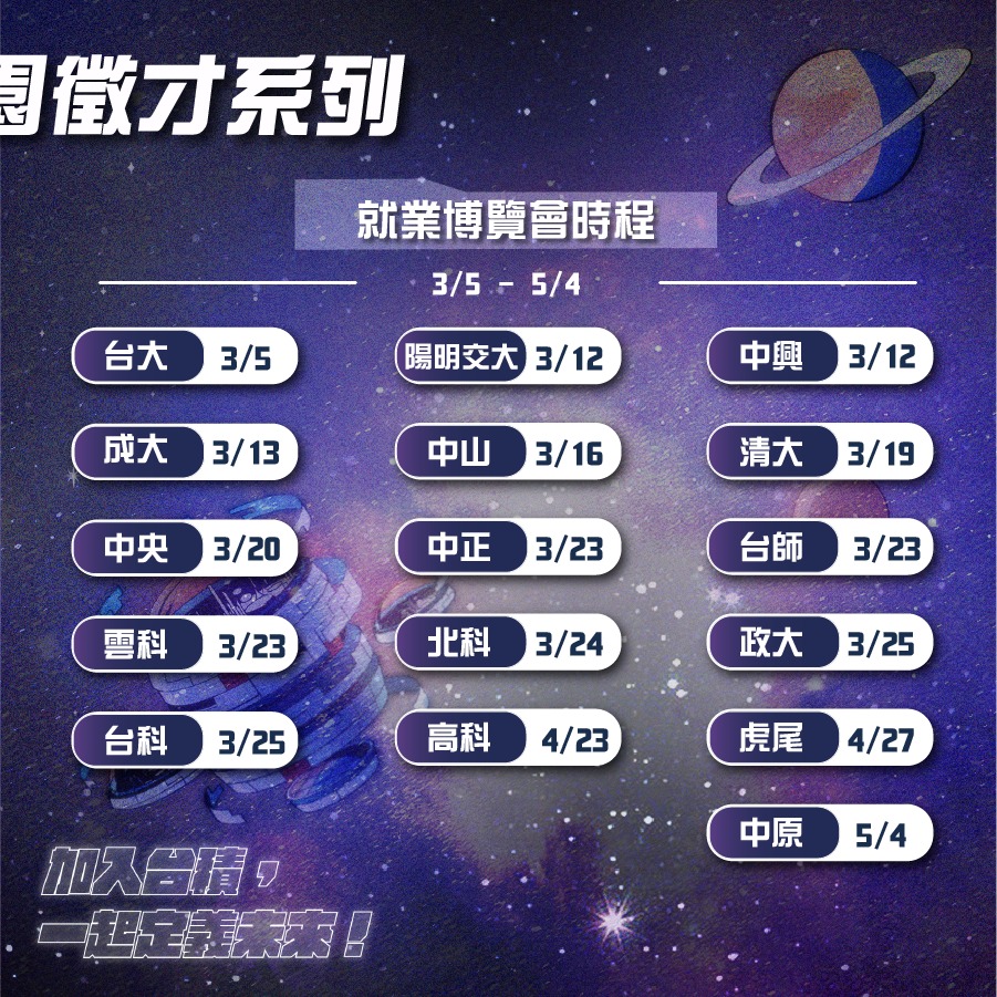▼台積電從3月開始陸續巡迴大專院校參與校園博覽會,其中包括台大、陽明交大、中興、成大、 清大、中山、中央、中正、台師、雲科、北科、台科、政大、中原、虎尾,並舉辦共18場實體企業說明會,讓學生更深入了解台積電及各項職務內容。除此之外,台積電還預計於台灣大學、陽明交通大學、成功大學以及清華大學分別舉辦校內面談會,給學生提供就近面試的機會。