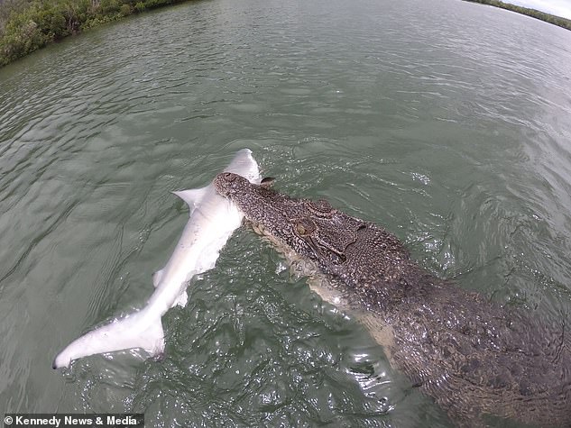 鱷魚叼著鯊魚回到岸邊,將牠全部吞下肚。這隻鱷魚顯然餓極了,才為了那條鯊魚鋌而走險,跟人類發生衝突。Barnes釣到的鯊魚竟然成為了鱷魚的美餐,這個世界太瘋狂啦~