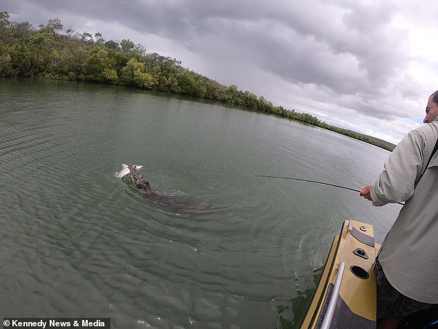 ▼Barnes拉住釣竿,想把鯊魚從鱷魚的嘴巴裡搶回來,但鱷魚的力量太大,他最終決定將鯊魚讓給鱷魚,讓牠飽餐一頓。Trutwein說:「我拍攝野生動物30年了,經常看到鱷魚,但從來沒有遇到過這樣的事。這太令人震驚了,近距離看到這一幕簡直難以置信!」