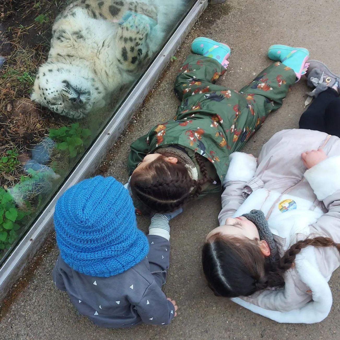 ▼小雪豹在玻璃展示窗旁翻肚熟睡,2個小女孩目不轉睛地盯著牠看,後來還躺在地上,跟小雪豹一起放鬆休息。她們不像平時一樣活潑吵鬧,還轉身向後面的人比出「噓」的手勢,以免不小心把小雪豹吵醒,這一幕看起來非常有愛。