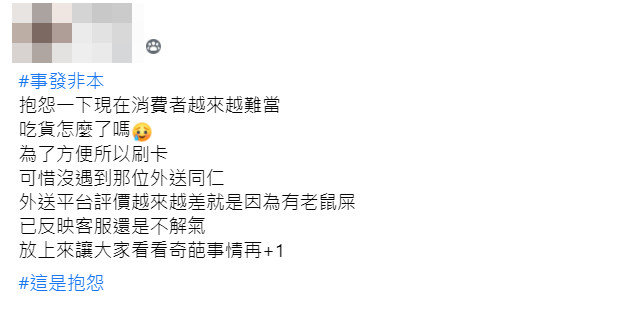 ▼原po表示,她是為了方便才刷卡取餐,沒想到竟然遇到這樣的外送員。「外送平台評價越來越差就是因為有老鼠屎,已反映客服還是不解氣,所以PO上網讓大家看看奇葩事情再+1」。她感嘆:「現在消費者越來越難當,吃貨怎麼了嗎?」