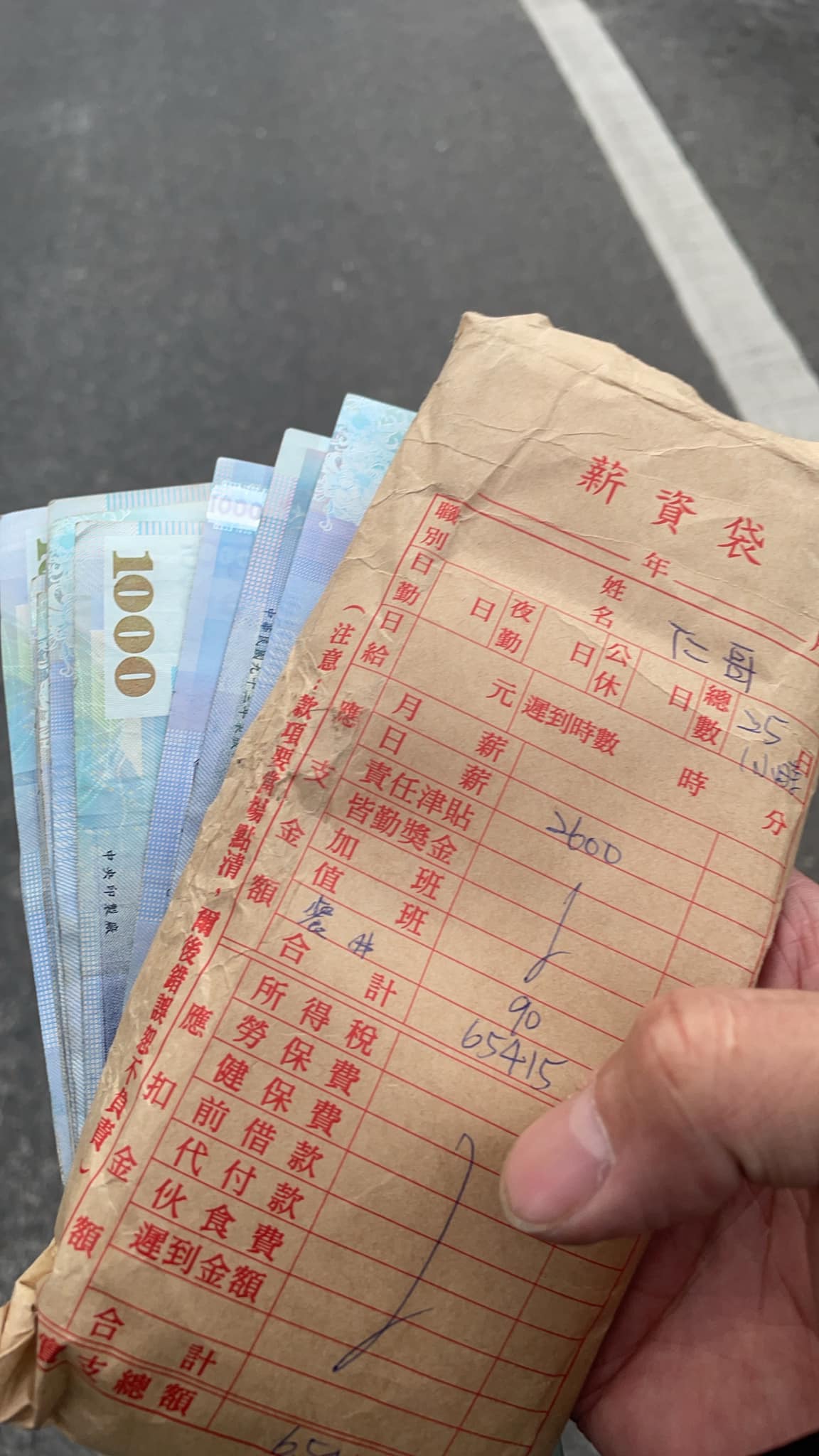 ▼楊男在11日傍晚返家途中經過羅東鎮竹林路,意外看到鈔票撒了一地。他連忙下車撿起來,清點後發現一共65400元。他還找到一個薪水袋,上面署名「仁哥」。楊男拿出手機拍照,並po到臉書社團「宜蘭知識+」上,說:「掉錢的朋友,別慌!錢已幫你送至公正派出所。」