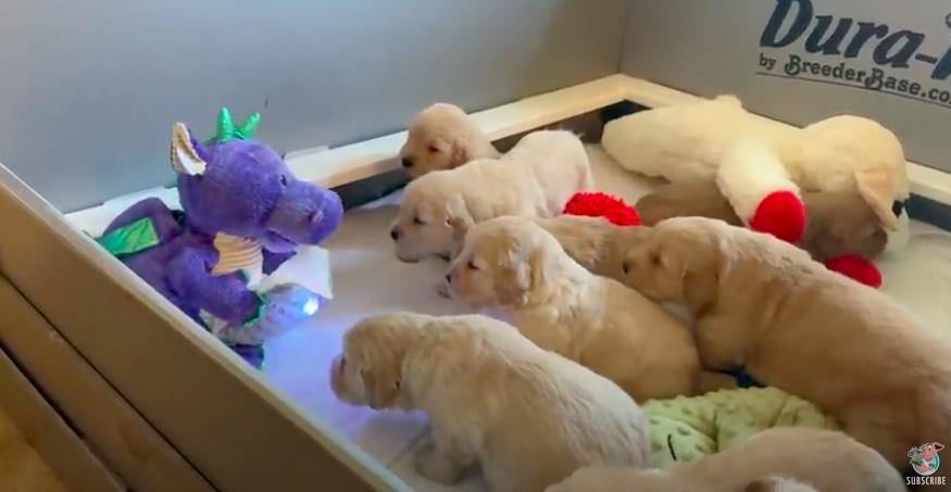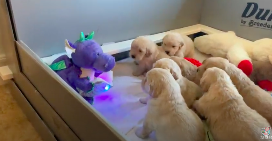 ▼一隻紫色的龍龍玩偶坐在角落,手裡捧著一本發光的書,正滔滔不絕地講故事。它講故事時還會左右搖晃身體,看起來很專注。狗寶寶們圍坐在身邊,都探著胖乎乎的身體往前擠,牠們對發光的書非常好奇。
