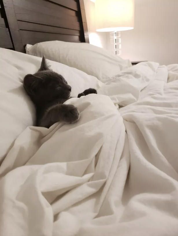 ▼白色床品和黑色的小貓最配了!