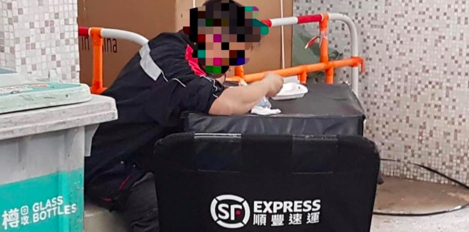 ▼3月15日,有網友在臉書專頁「小西灣富景花園居民聯絡組」發文,稱在富景花園第9座地下行人通道,看到一名順豐送貨員坐在通道旁邊的一張長櫈上,把手推車當飯桌,並脫下口罩用餐。原po認為,送貨員在街頭進食影響衛生,自己已向物業管理公司及保安公司投訴。