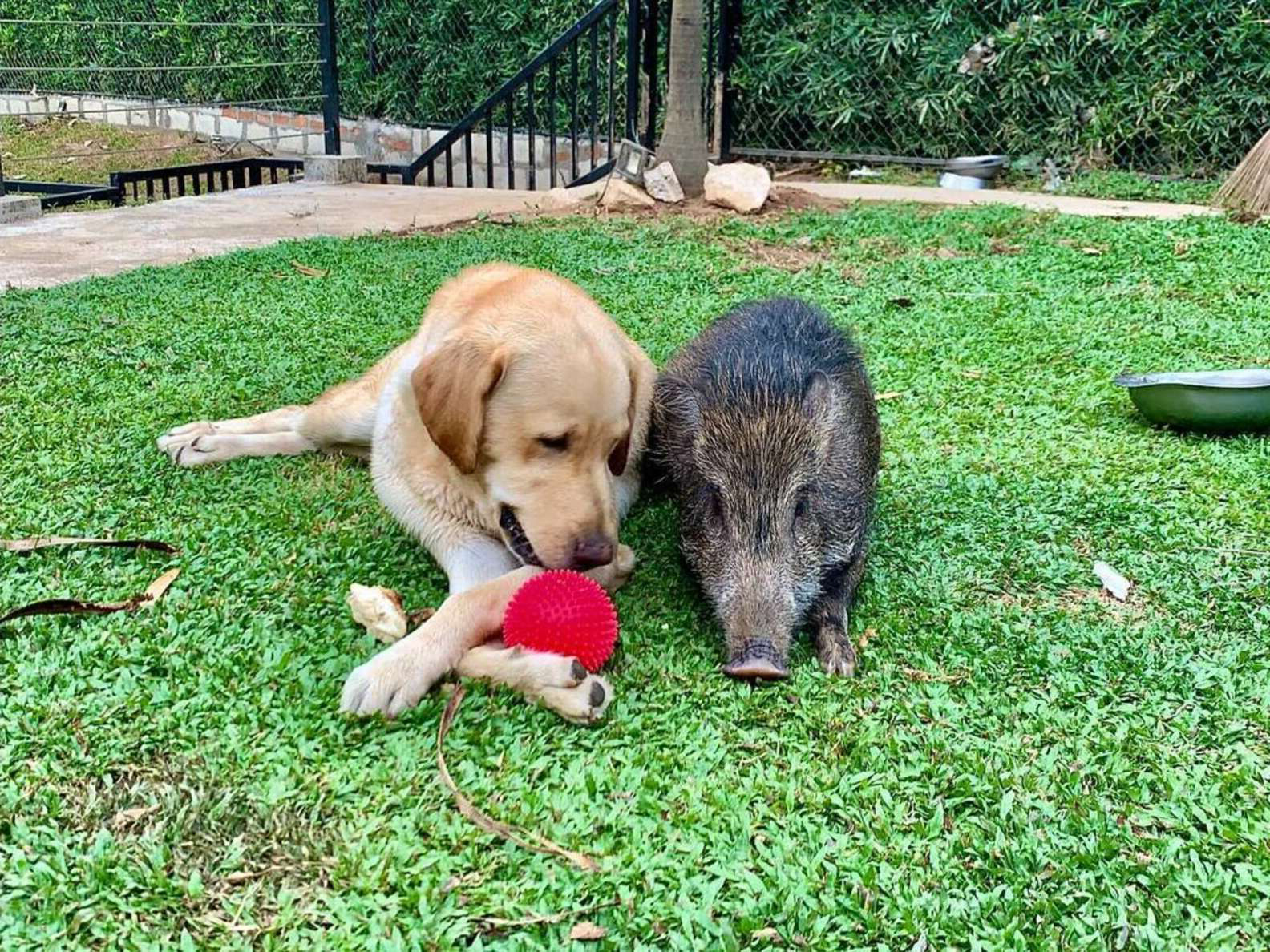 ▼Yezhu很喜歡狗狗們,尤其是其中的一隻拉拉。牠總是跟在拉拉身後,跟牠一起玩耍、一起休息。牠可能以為自己也是一隻狗狗吧。