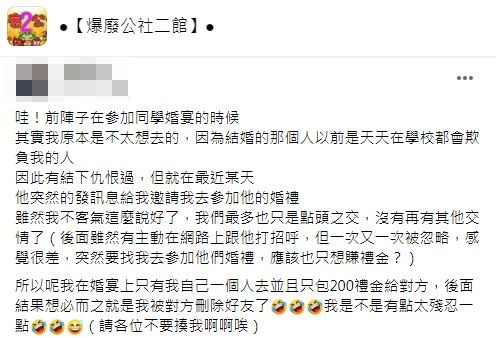 ▼原po當下認為,兩人最多是點頭之交,「突然要找我去參加他們婚禮,應該也只是想賺禮金」?婚禮當天,原po還是前去赴宴,但她只包了200元禮金,因為金額太少,婚宴結束就被對方刪除朋友關係。原po忍不住笑說:「我是不是有點太殘忍一點,請各位不要揍我啊!」