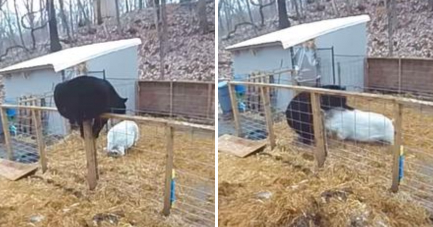 ▼Rebecca表示,當時家人發現有黑熊在附近遊蕩,查看監視器畫面才看到,黑熊跳進了豬豬們所在的圍欄裡。大家都為2隻小豬捏把冷汗,但牠們表現得非常勇敢。Hammy和Mary成功將黑熊趕走,自己並沒有受傷。Rebecca說:「我為牠們感到驕傲!」