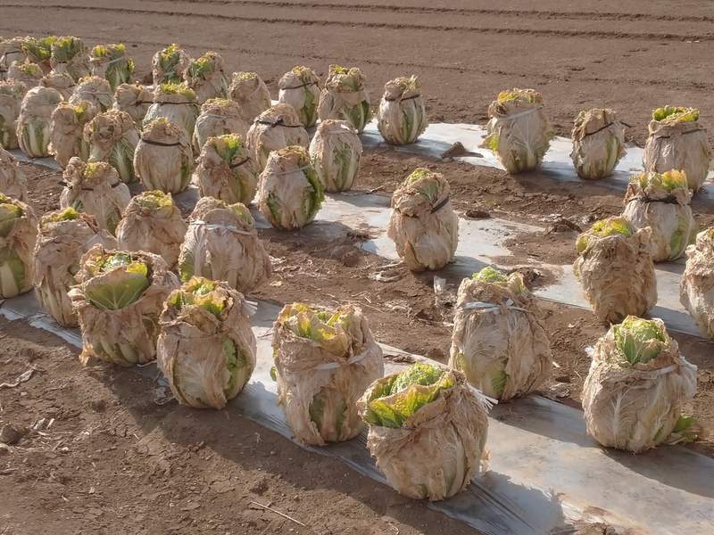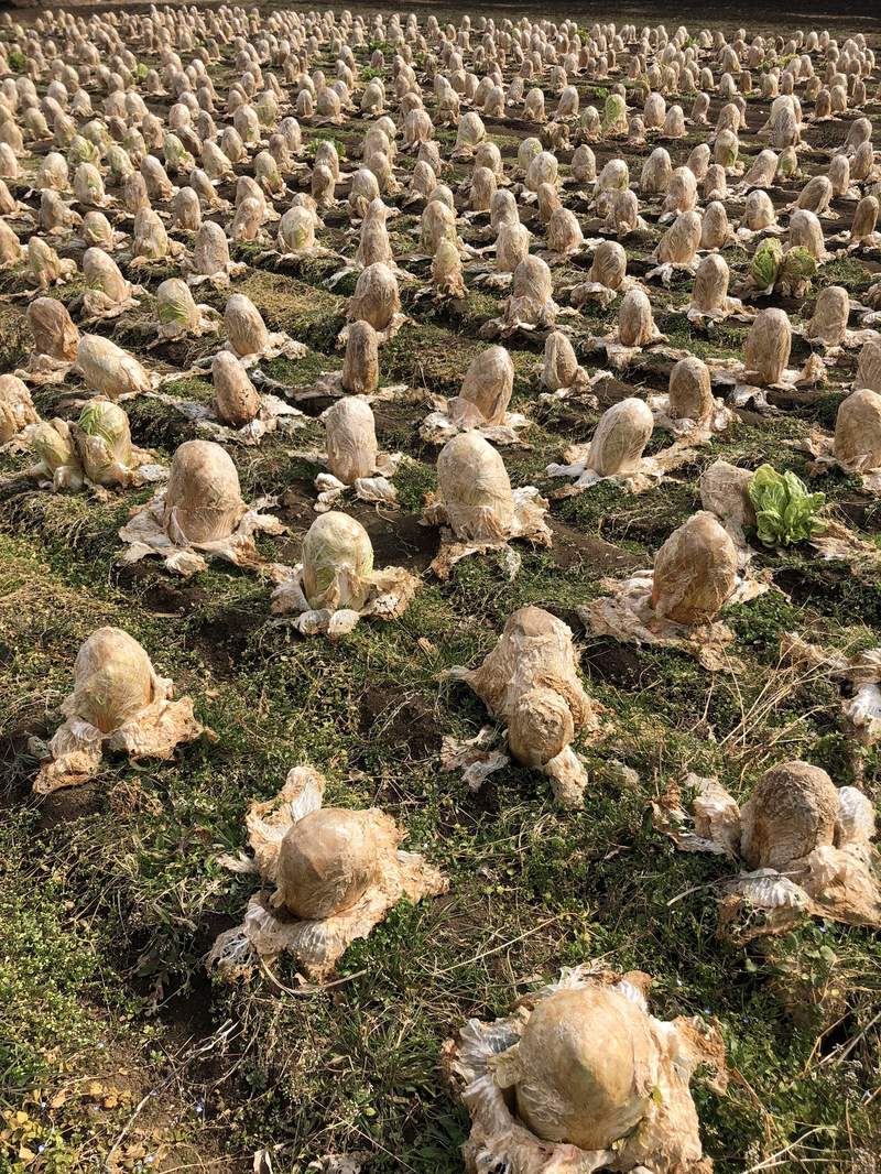 ▼今年是暖冬,蔬菜大豐收,銷量沒有往年好,再加上他們家自己吃火鍋的次數變少,所以很多沒有收成的白菜留在田裡。這種狀態的白菜已經沒辦法收成賣出去了,只能當肥料滋養土地。