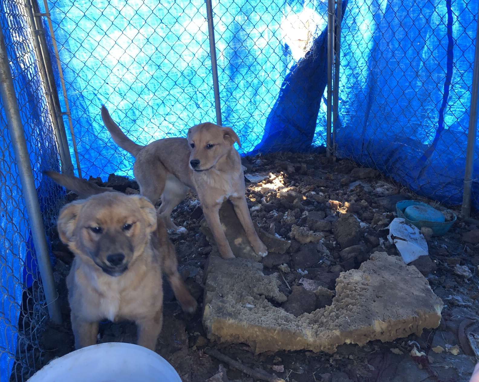 ▼這3隻狗狗被關在狹小的鐵網圍欄裡,頂部只用帆布蓋著,地板上有石頭、泥土和垃圾,環境非常髒亂。Jane和同事連忙將3隻狗狗帶回收容所,讓牠們可以得到妥善的治療與照顧。