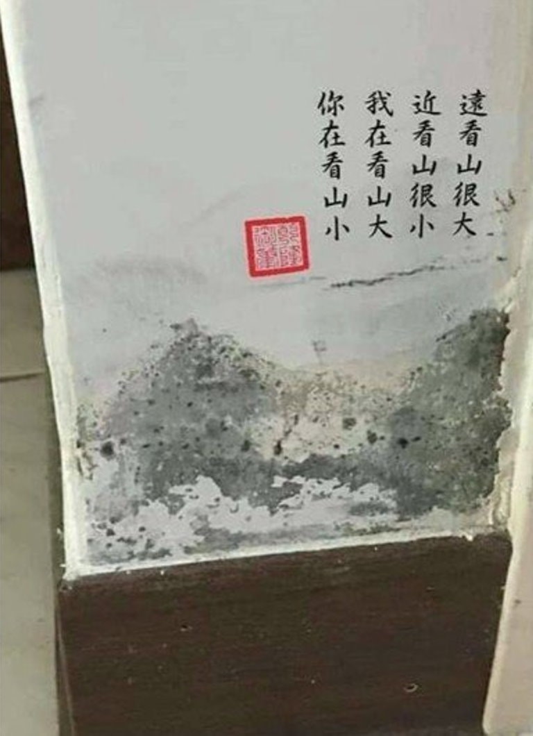 ▼屋主在爆廢公社分享了自己的創意,在斑駁的牆壁上題了一首詩,整面牆壁瞬間變成充滿意境的「立體山水畫」。網友們紛紛被他的創意震撼表示「這是個人才,高手高手高高手」、「大師級傑作」、「請收下我的膝蓋」、「被抓漏工程耽誤的國畫大師」。