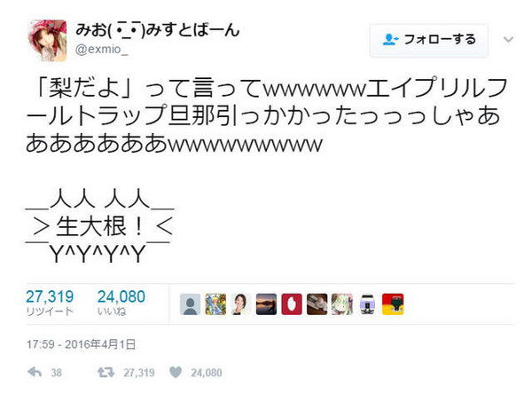 2022年03月31日愚人節那天大家有被整嗎?今天我們要說的就是一對互相惡整的日本夫妻。一年前的4月1日,賢慧的老婆特地切了一盤水梨給老公吃。當時老公覺得超暖心,這個老婆真是娶對了!但咬下去後臉色立刻變得慘白……