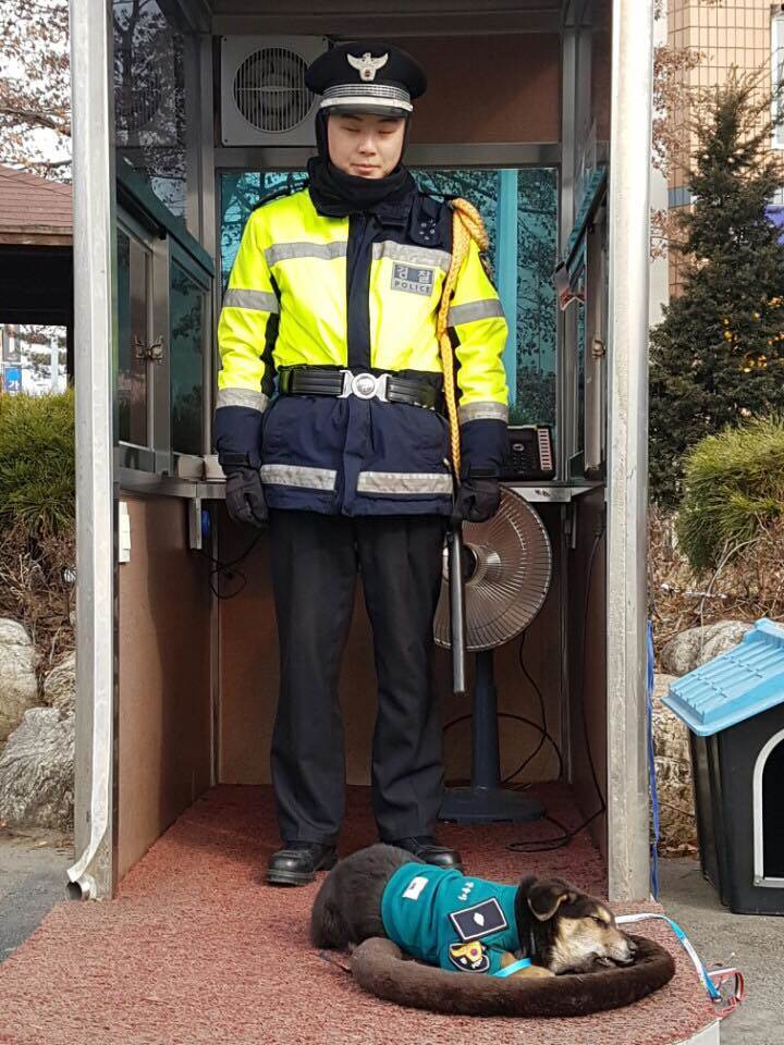 2022年04月01日韓國京畿道加平警局警衛室有一隻可愛的小警犬。牠穿著綠色制服,看起來很有精神。這隻小黑狗原本是一隻浪浪,牠自己上門,跑到警局應徵當警犬,還陪警員值班一整夜。警員們被牠感動,於是給了牠一個機會,讓牠成為了警局中的一員~