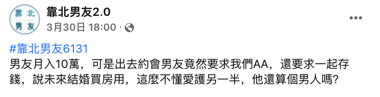 ▼原po在貼文中說,男友月收入10萬元,但每次出門約會都要求AA制。男友還說兩人要一起存錢,這樣以後結婚才有買房基金。原po完全不理解男友的行為,她認為對方實在太不懂得愛護另一半了,不禁抱怨:「他還算個男人嗎?」