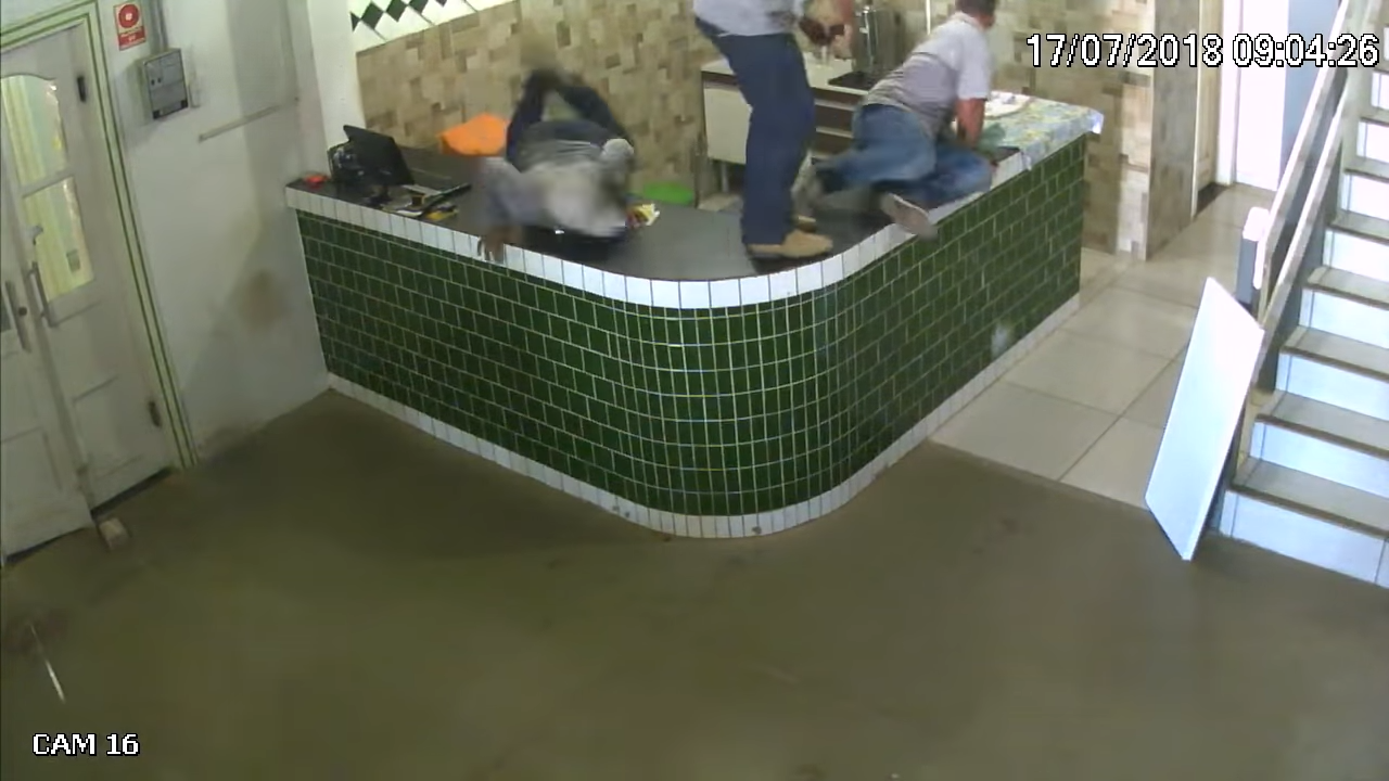 ▼當時5、6名工人正在櫃檯旁做工,牛頭梗突然闖進來。一位拿著電鑽的工人嚇得躲起來,其他人愣住片刻,然後開始躲藏。有人逃到隔壁房間,還有人躲在櫃台後,但狗狗沒有離開,竟追到了櫃檯後面。