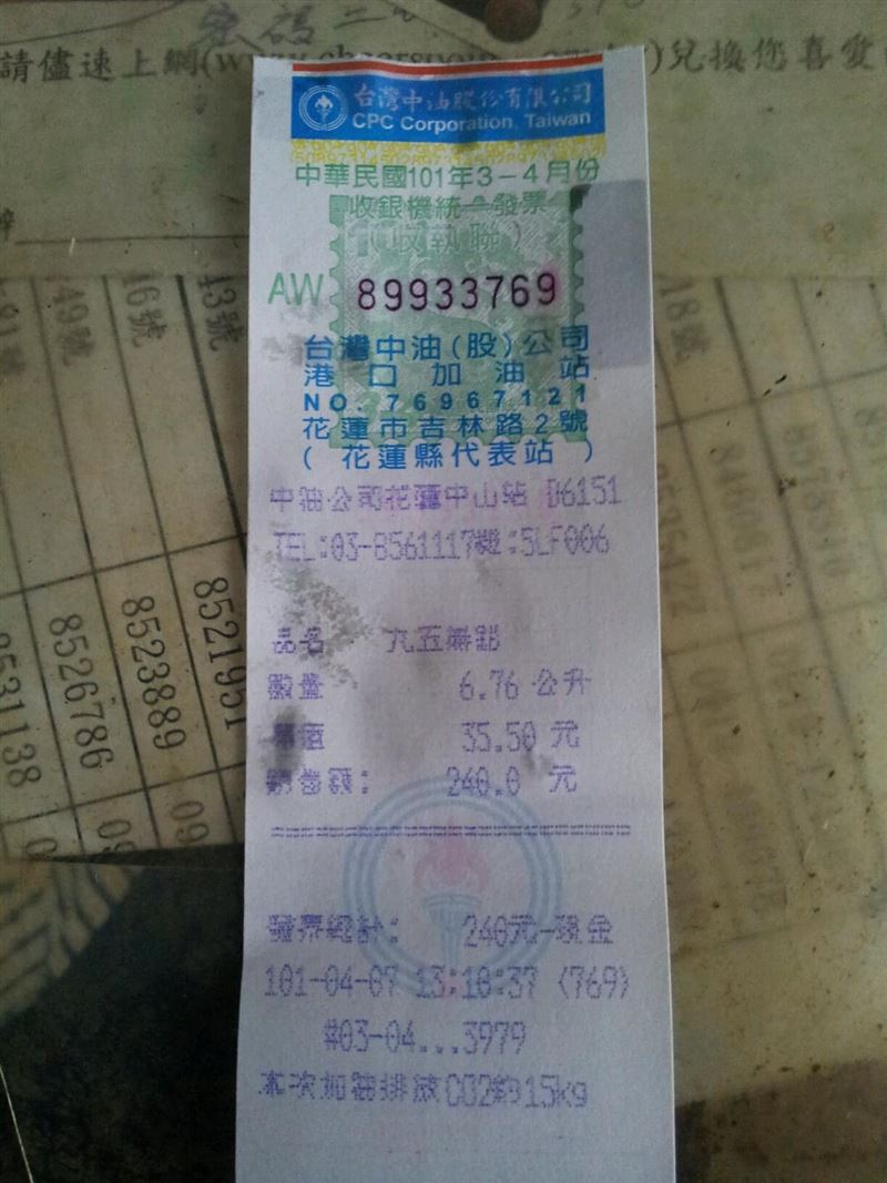 ▼原po曬出一張2012年3、4月的發票,顯示油價單價35.5元。當時他在花蓮加油,加了6.76公升的95無鉛汽油,總計240元。當前中油95無鉛汽油每公升32.5元,機車汽油加滿竟比以前便宜。原po不禁感嘆:「11年前的油價真的比現在高,125機車(勁戰2代)加滿要240元。」